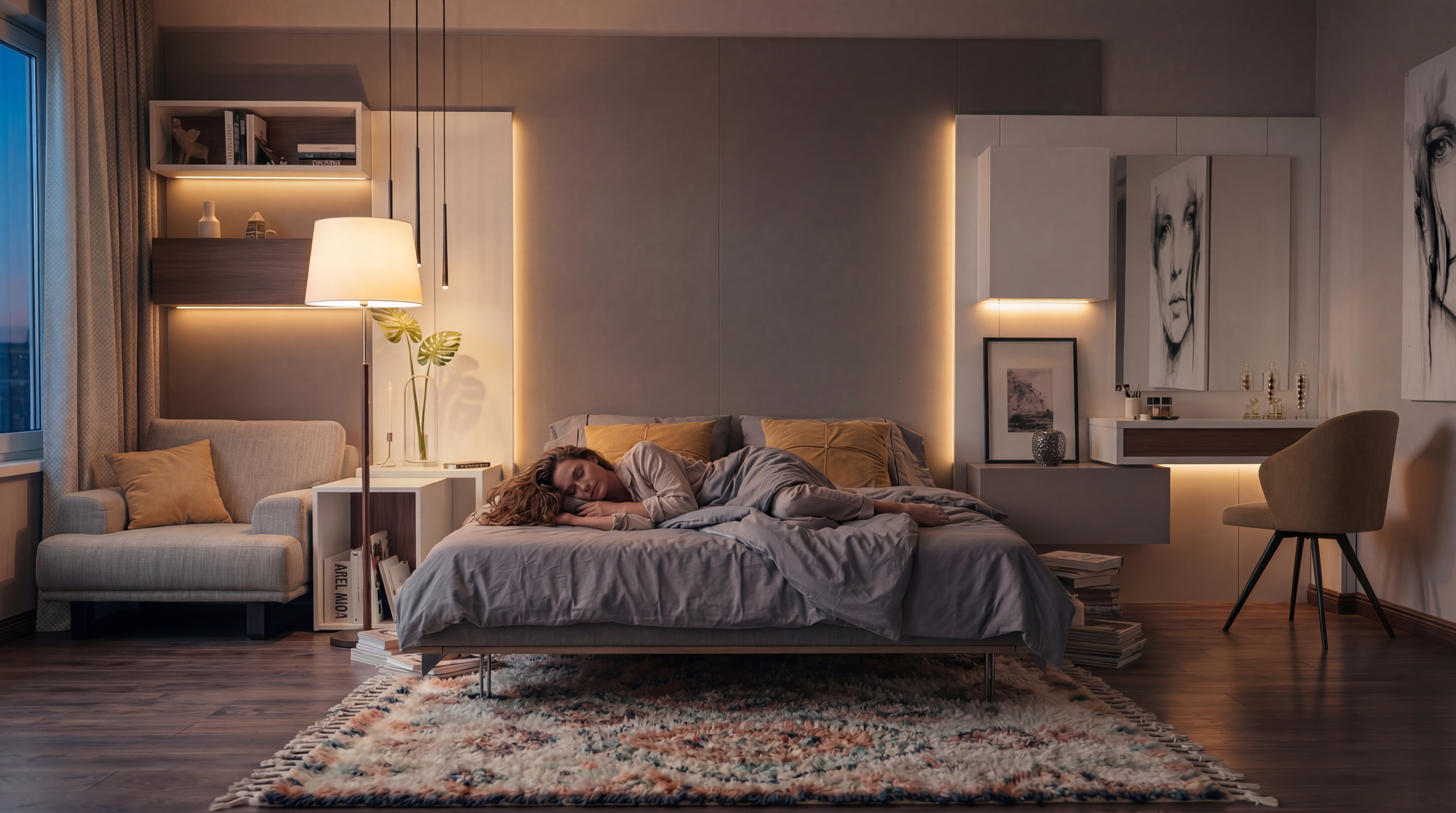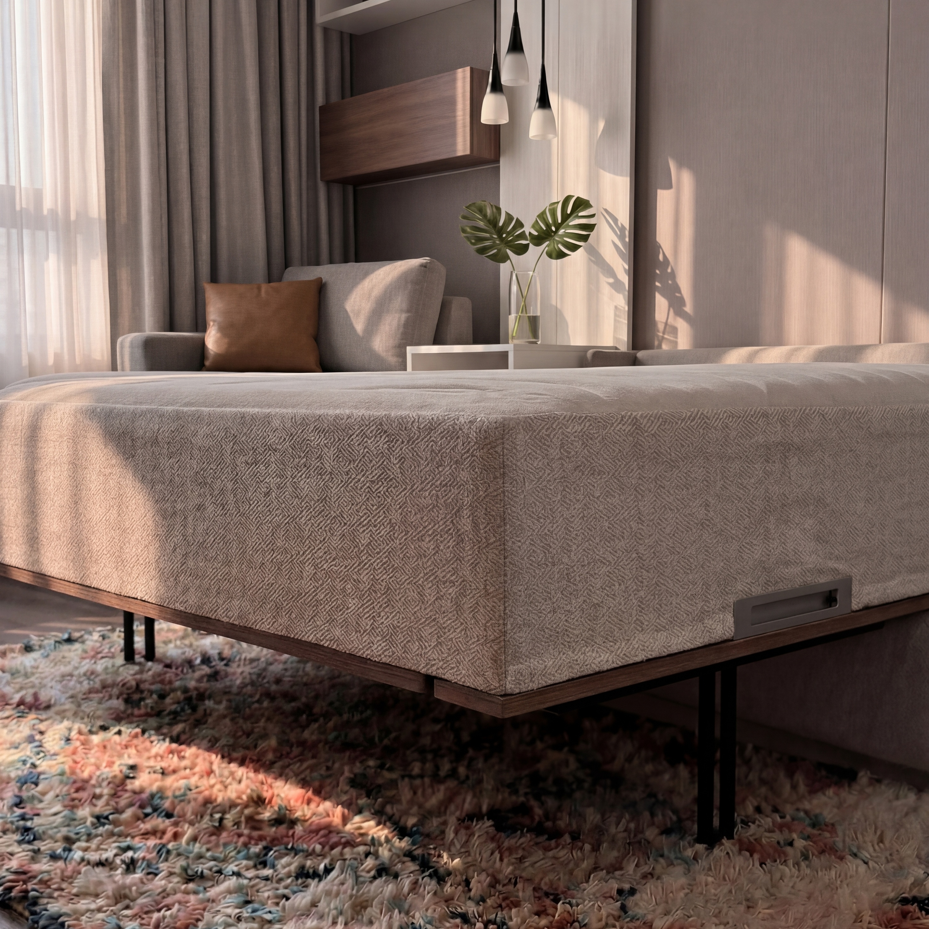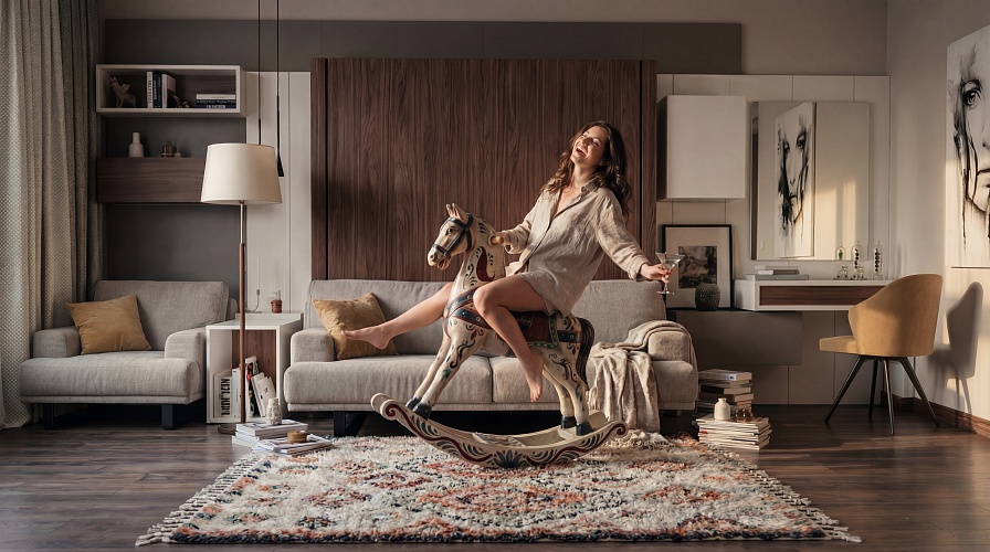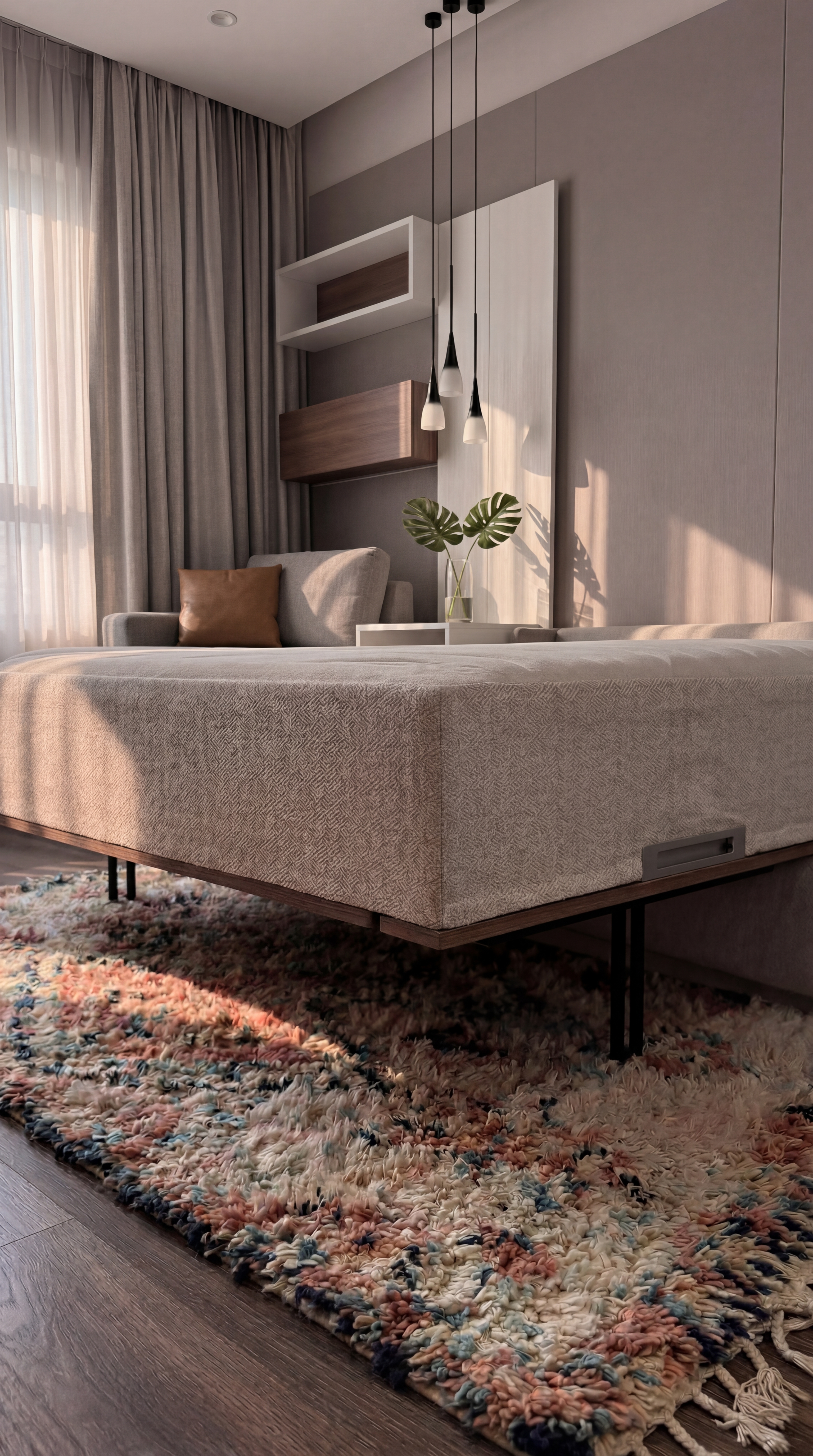Днем кровать убирается, освобождая место для игр. Никакой громоздкой мебели — только счастливый ребенок на ковре.
