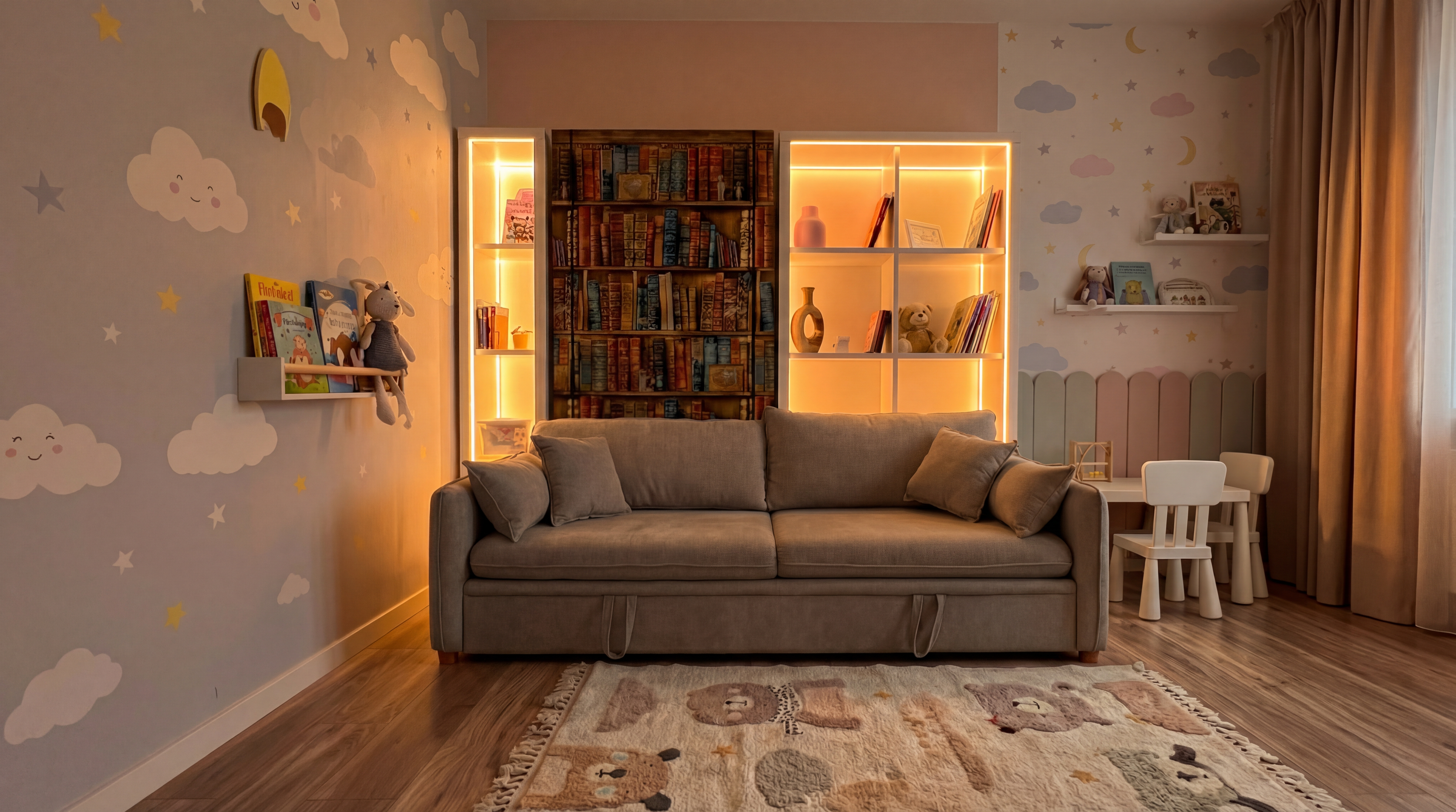 Стеллажи с подсветкой мягко освещают комнату. А ламели из березы с ортопедическим матрасом заботятся о здоровье малыша.