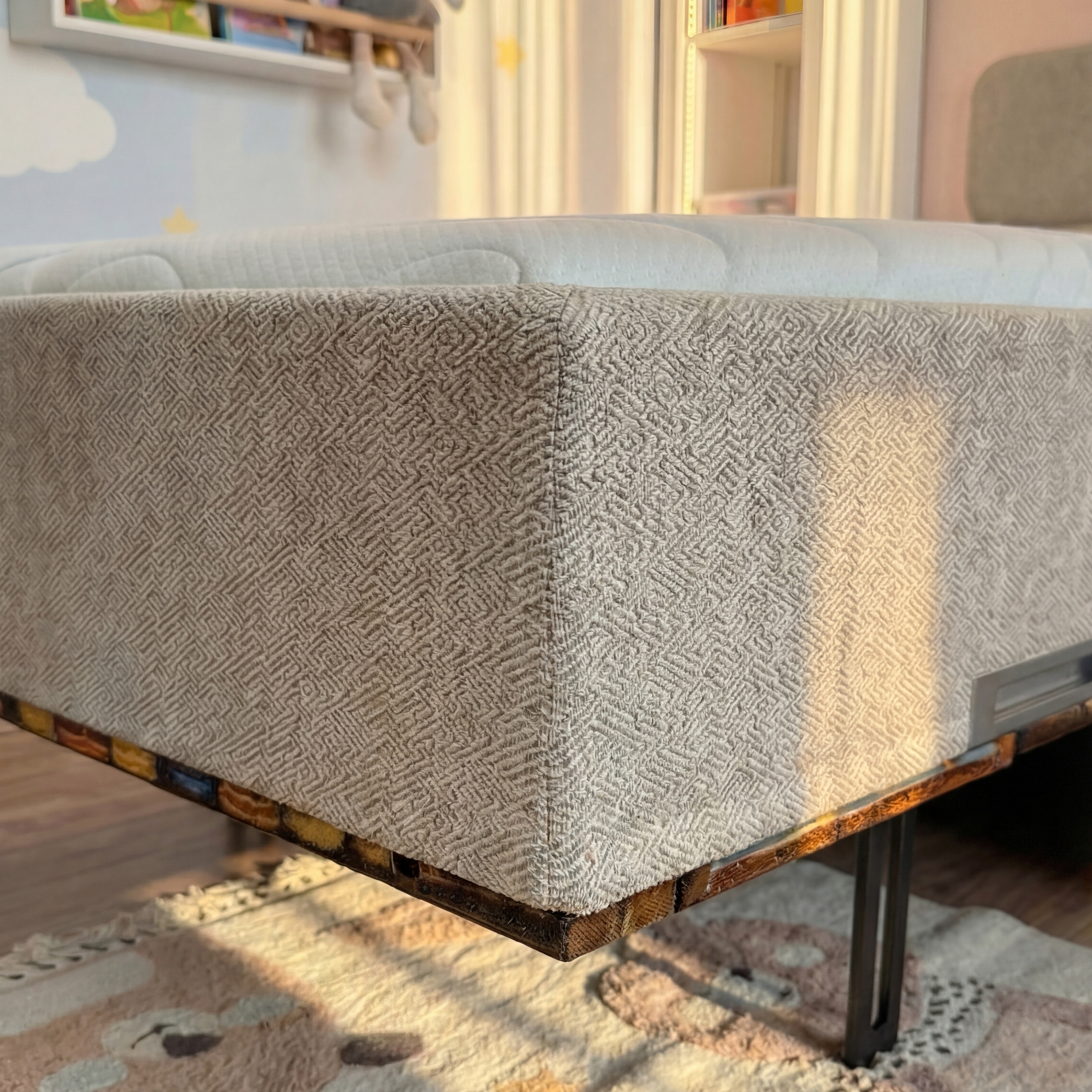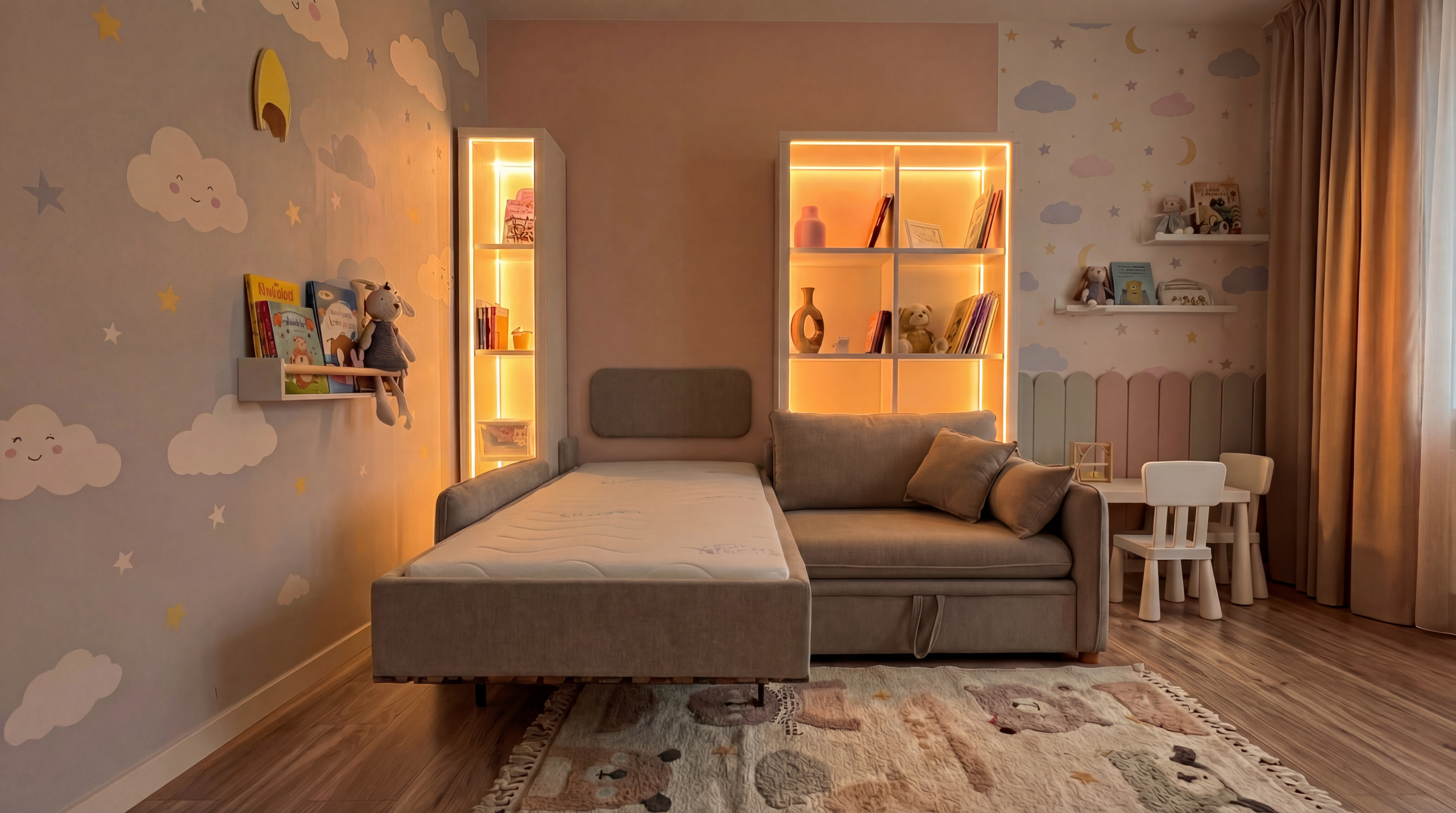Днем кровать убирается, освобождая место для игр. Никакой громоздкой мебели — только счастливый ребенок на ковре.