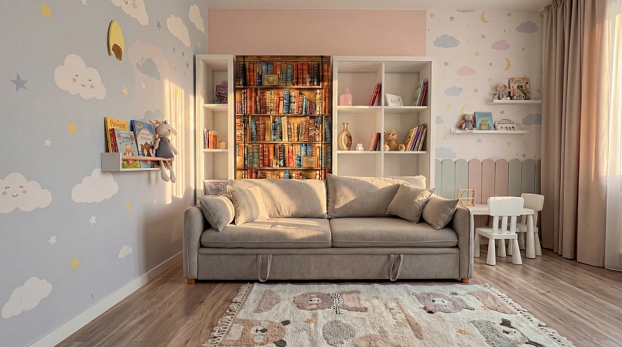 Когда кровать разложена, на диване остается уютное «родительское место». Можно присесть и почитать сказку на ночь или после работы зайти пошептаться перед сном.