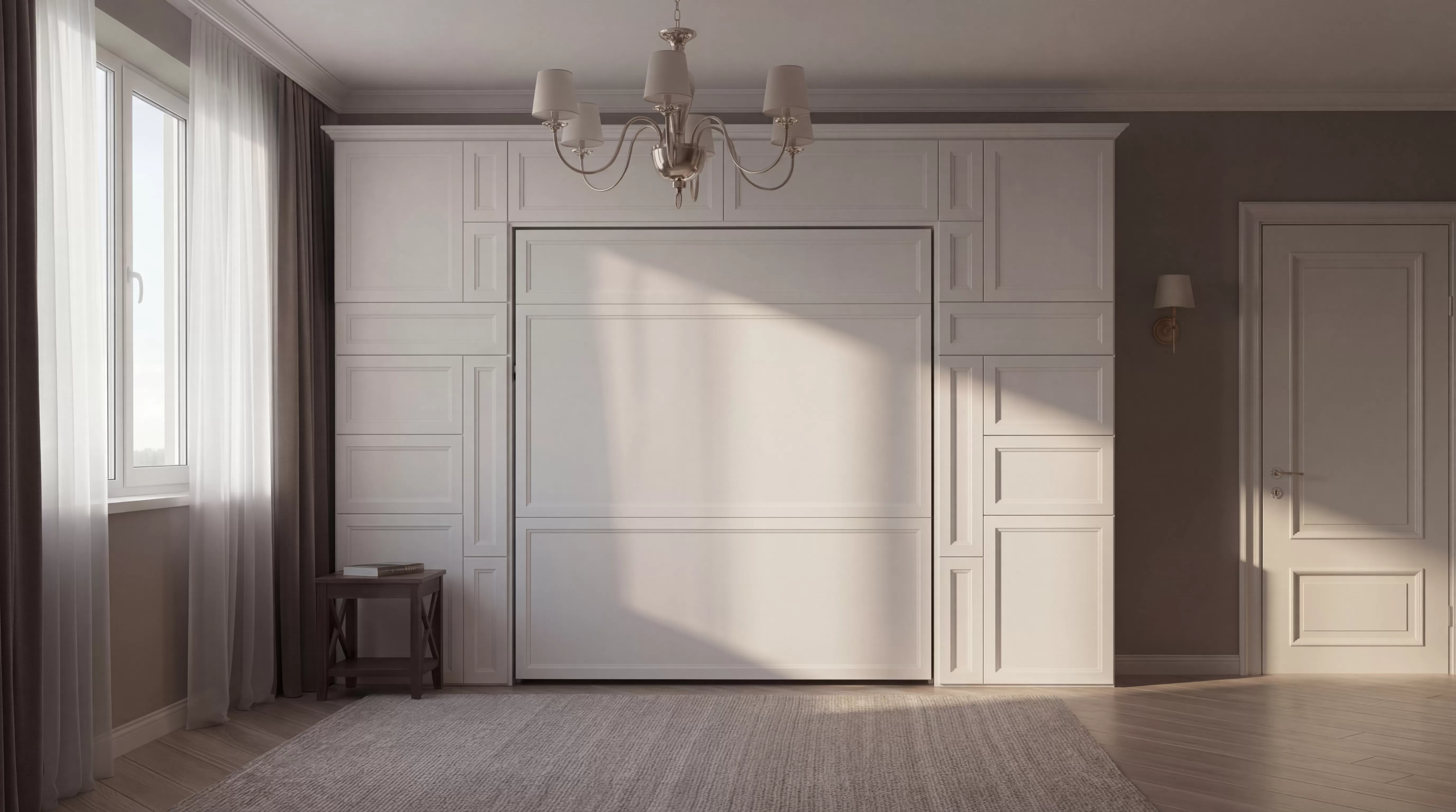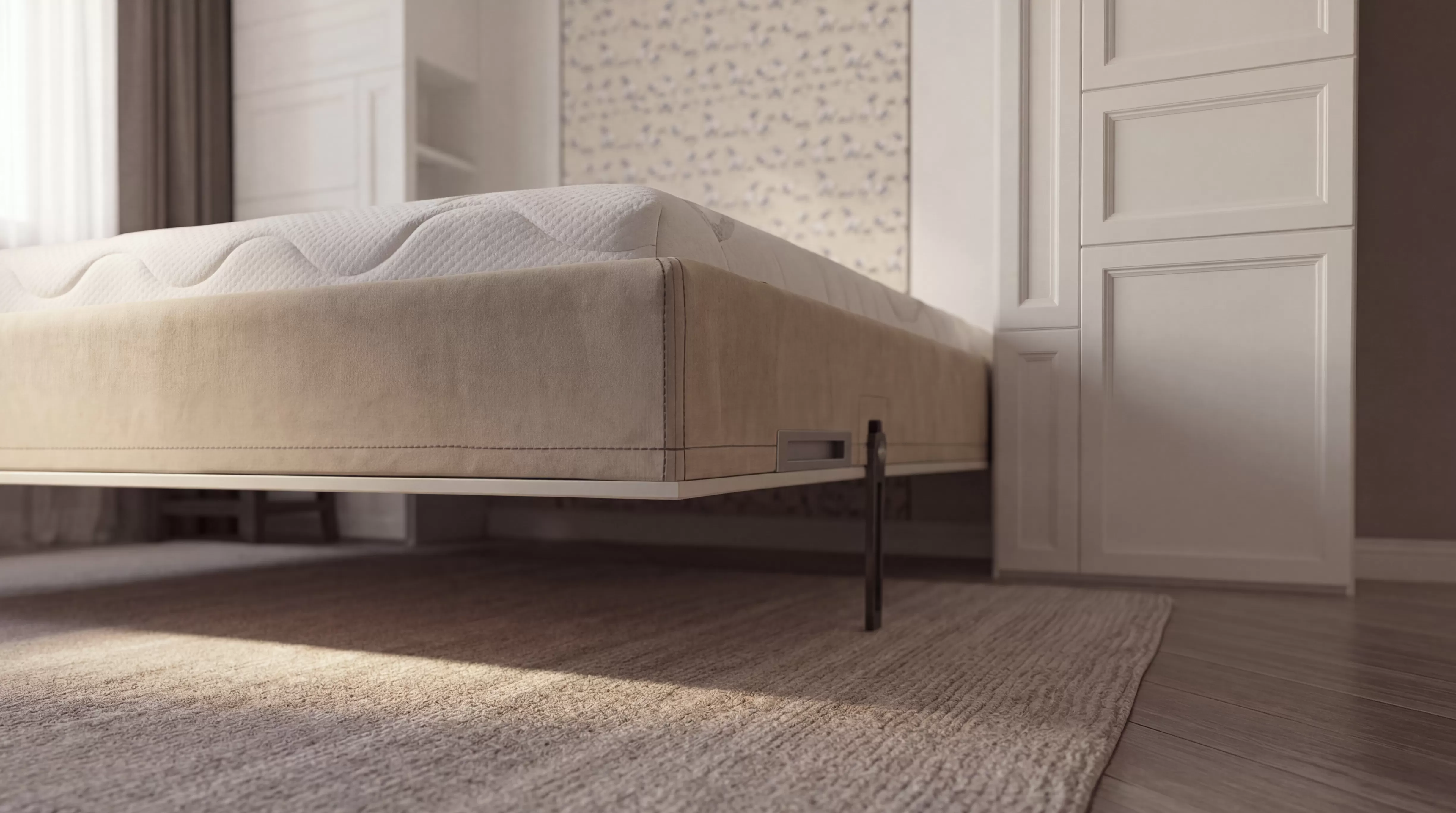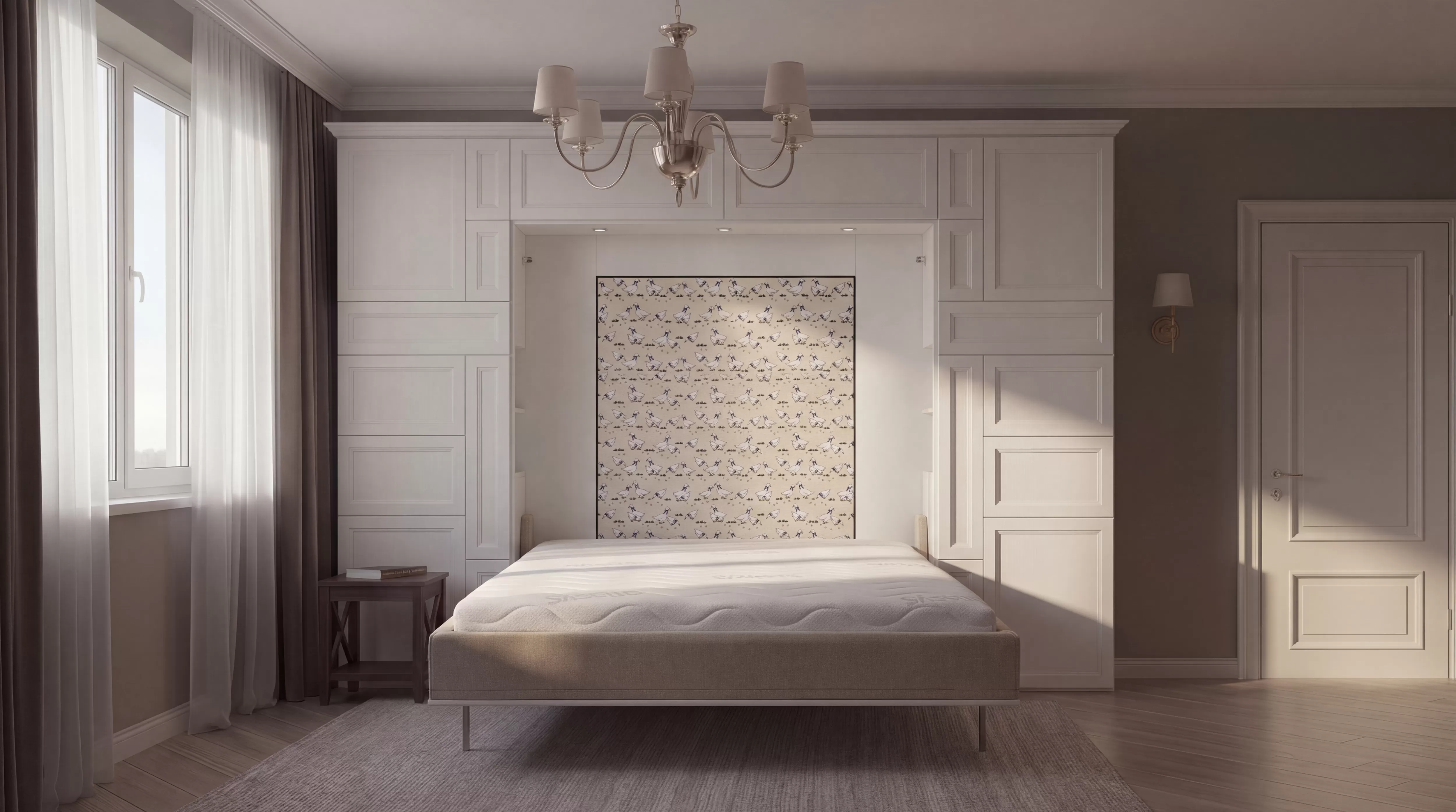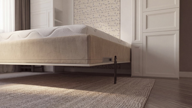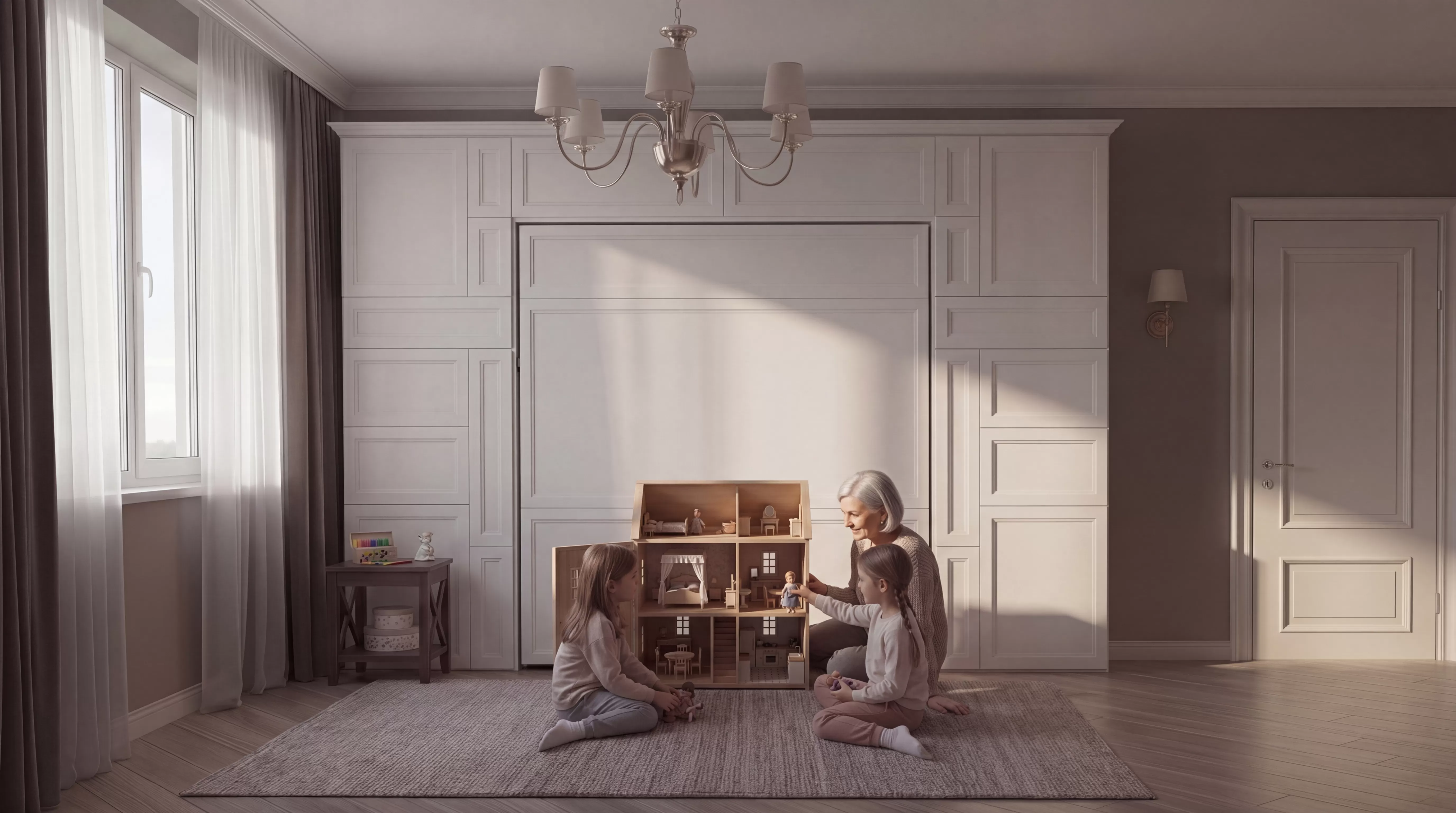 Днем кровать убирается, освобождая место для игр. Никакой громоздкой мебели — только счастливый ребенок на ковре.